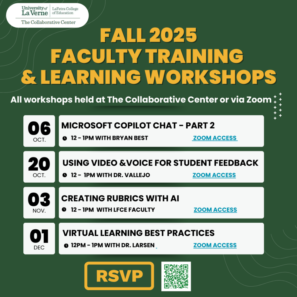 This past fall, The Collaborative proudly supported La Verne’s LFCE Faculty through a dynamic series of teaching and learning workshops. The series highlighted cutting-edge educational practices, innovative instructional technologies, and strategies to enhance student engagement.